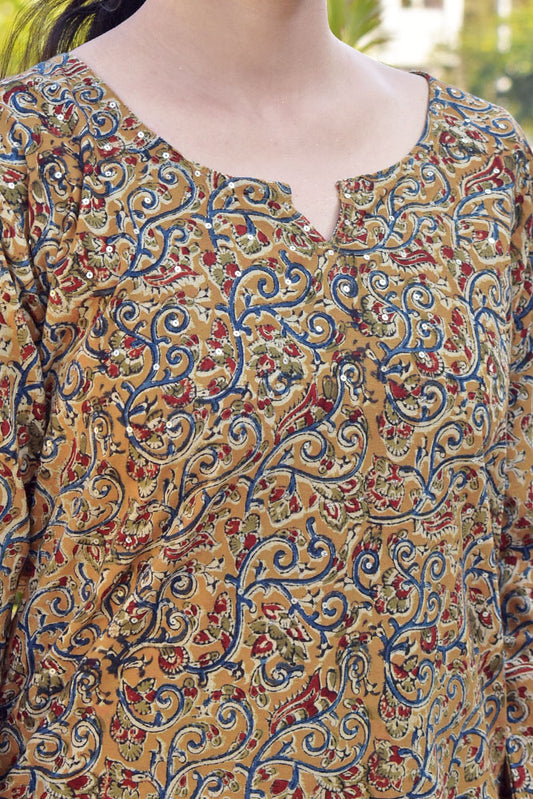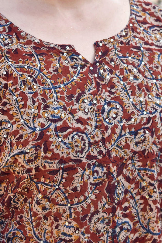 Machalipatnam Kalamkari Hand Block Printed Cotton Short Kurta with sequins on yoke - Size - 36