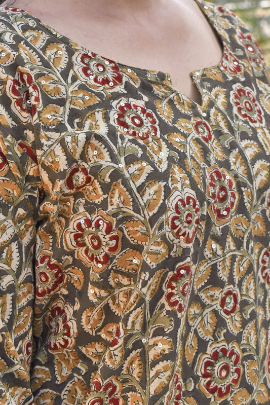 Machalipatnam Kalamkari Hand Block Printed Cotton Short Kurta with sequins on yoke - Size - 40