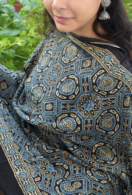 Elegant Modal Silk Ajrakh Block Print Dupatta with zari lagdi patta palla & Tassels