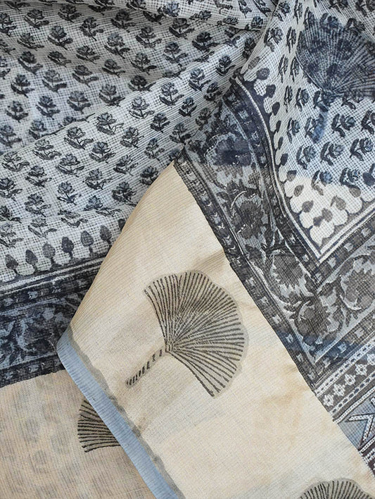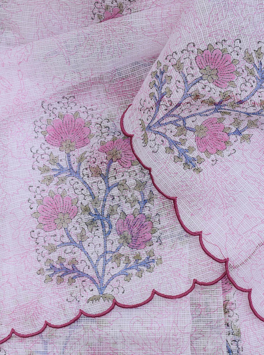 Elegant Kota Cotton Saree with scalloped ends & dual hand block prints