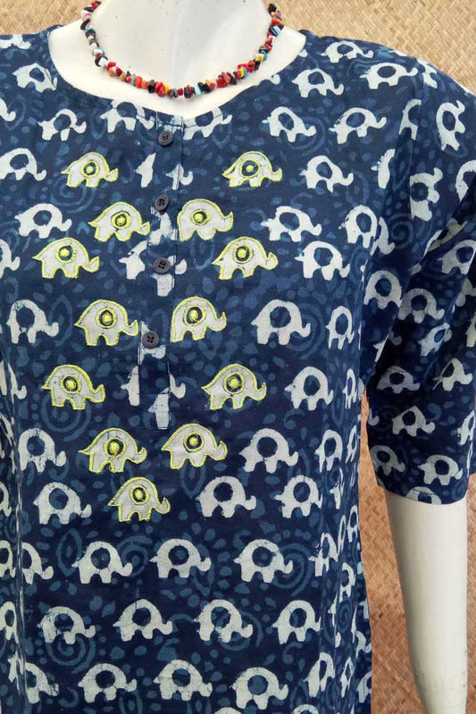 Elegant Block Printed Indigo Cotton Kurta - Size 44