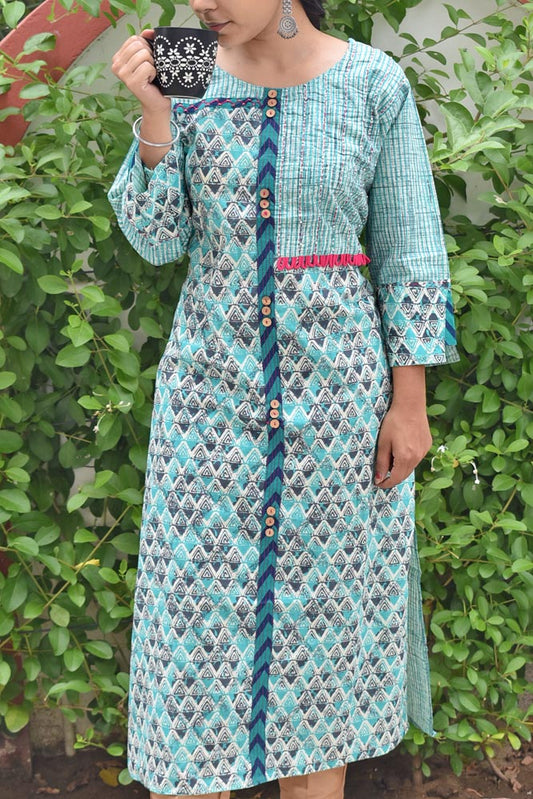 Elegant Block Print Cotton Medium Length Kurta - Size -36