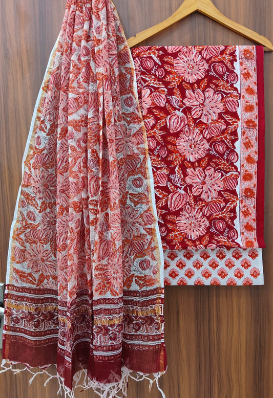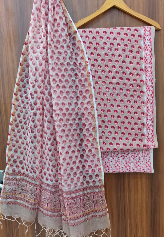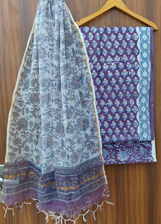 Beautiful Hand Block Printed Cotton unstitched suit fabric with Kota Doria Dupatta