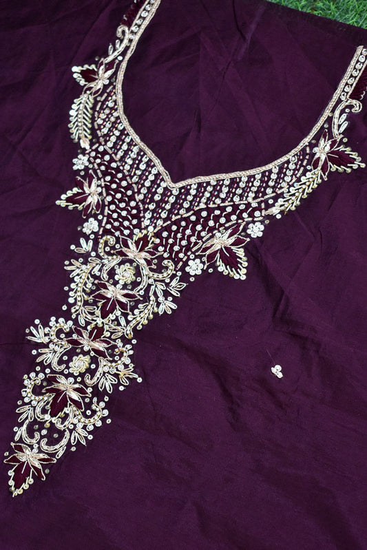 Beautiful Hand Embroidered Chanderi unstitched suit fabric with Banarasi Dupatta & Matching Potli bag & Jutti