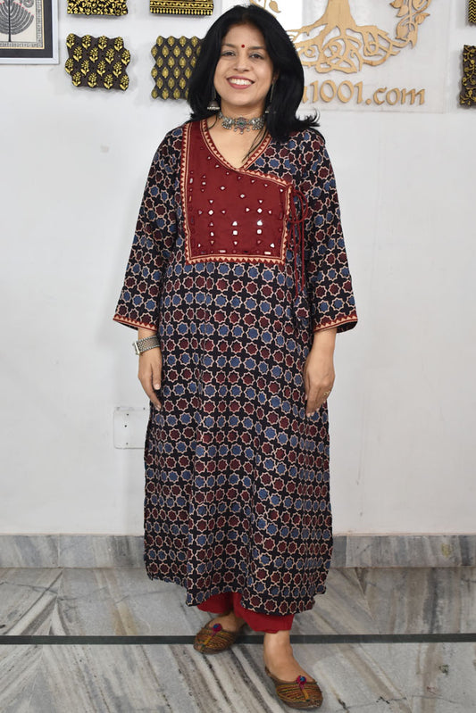 Designer Hand Block Printed Ajrakh cotton Kurta with Kutch Mirror work