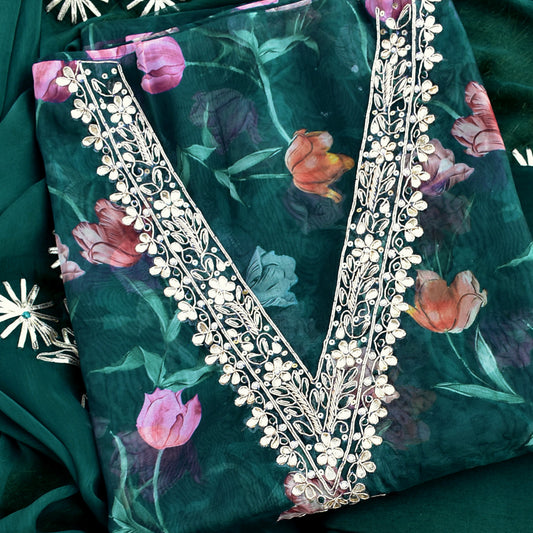 Beautiful Organza unstitched suit fabric with Gota Patti Work, Hand embroidery & Chiffon dupatta with Gota Work