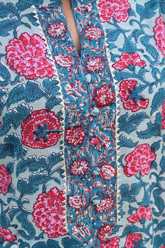 Hand Block Printed Cotton suit with Hand Embroidery - Kurta , Kota Dupatta & Pant - size 38, 40, 42, 44, 46