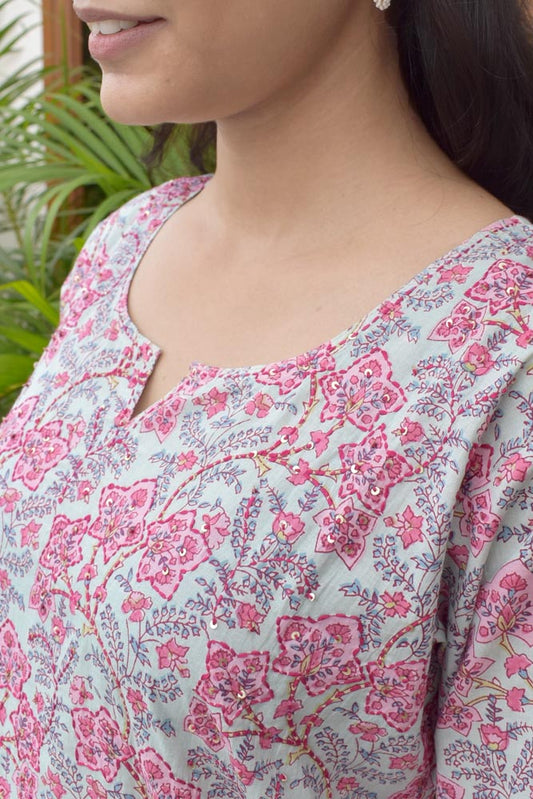 Beautiful Cotton Kurta with Hand Tagai Embroidery & Aari work & Embroidered Sequins Size - 38, 40, 42, 44