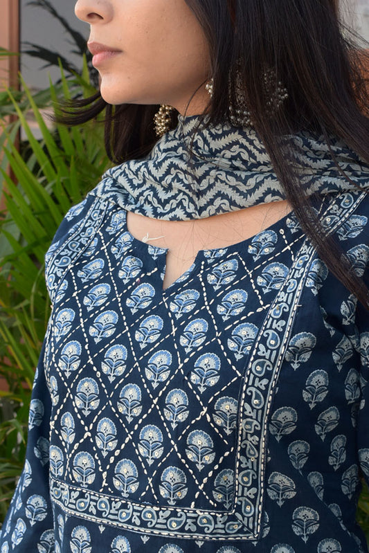 Hand Block Printed Cotton suit with Hand Embroidery - Kurta , Kota Dupatta & Pant - size 38, 40, 42, 44, 46