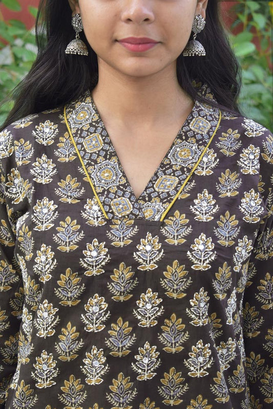 Beautiful Hand Block Printed Ajrakh Cotton kurta with Kutch Mirror work , Size 38 to 50 ( all sizes)