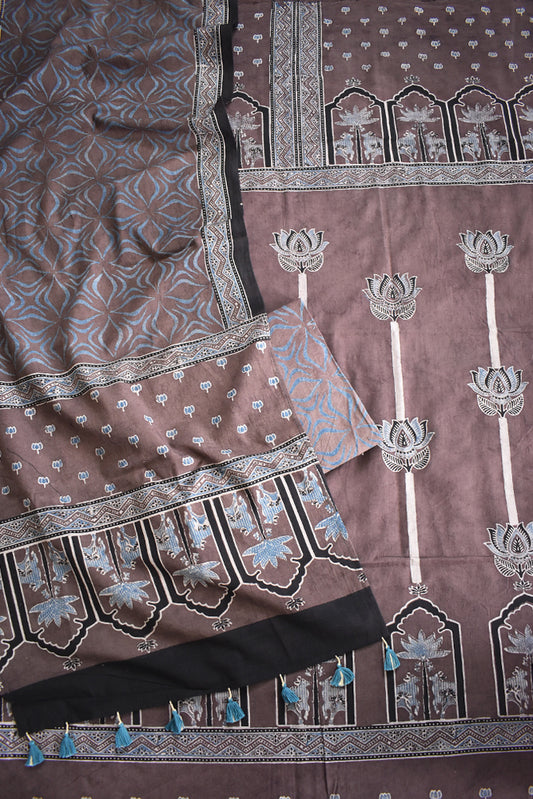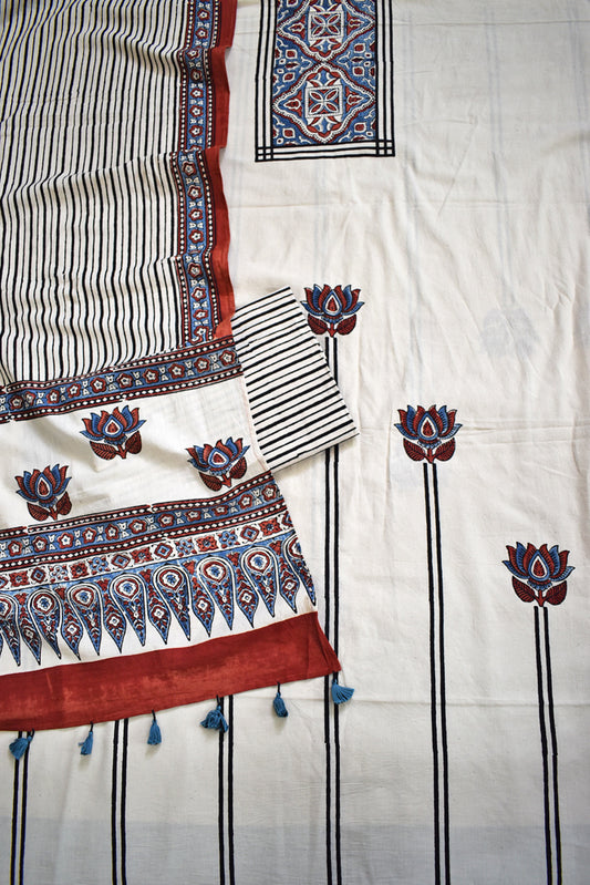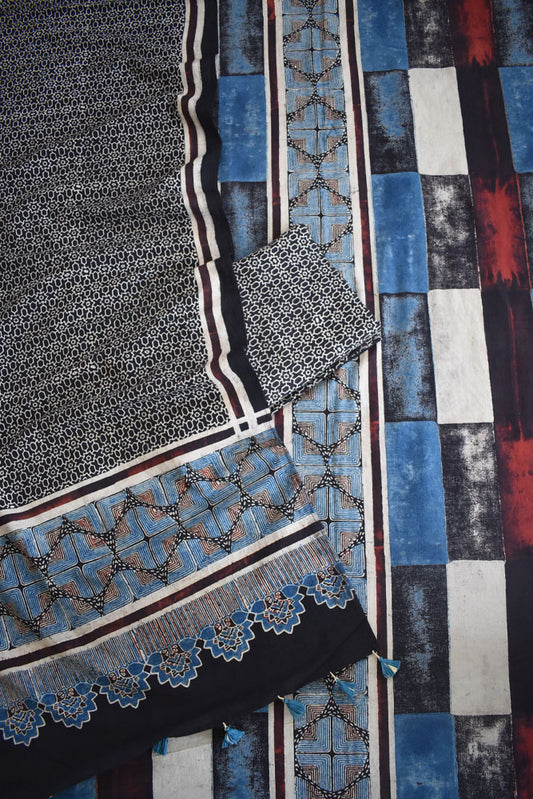 Block Print Ajrakh Cotton Suit with designer Ajrakh neck yoke /panel & Long Stole