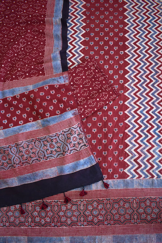 Ajrakh Hand Block Printed Khadi Cotton Stole with Tassels & natural dyes