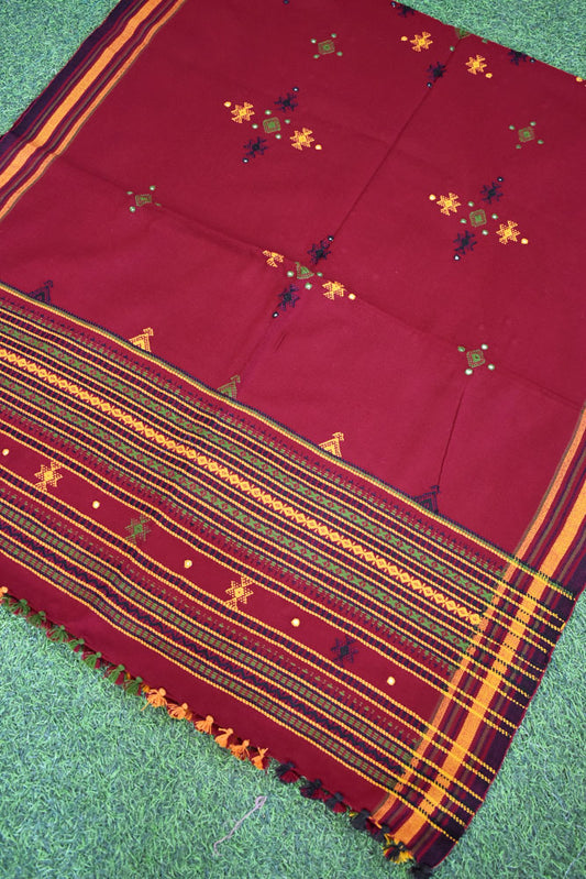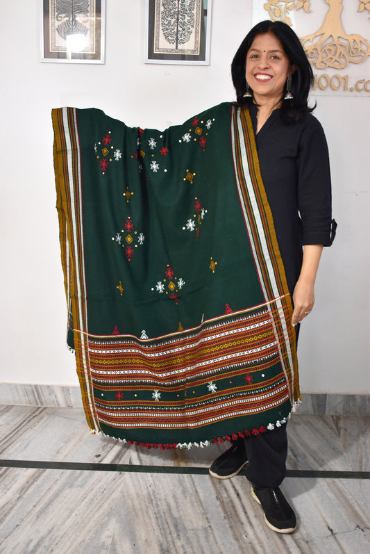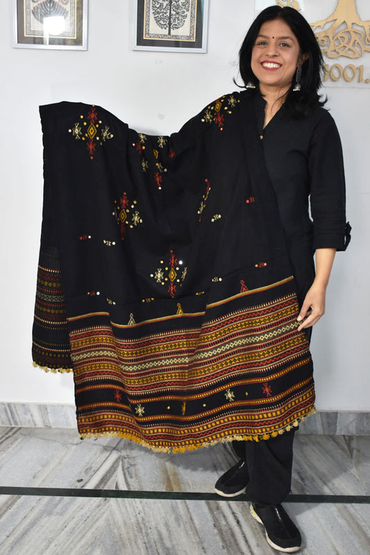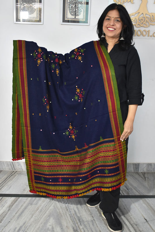 Handwoven Bhujodi Intricate Hand Embroidery & Hand Mirror Work Woolen Shawl