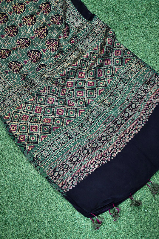 Beautiful Hand Block Printed Ajrakh Modal Silk stole with Tassels