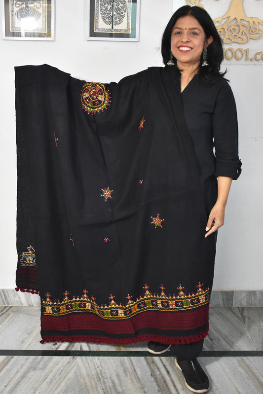 Handwoven Bhujodi Intricate Hand Embroidery & Hand Mirror Work Woolen Shawl