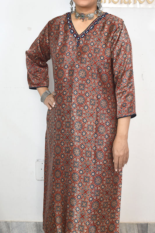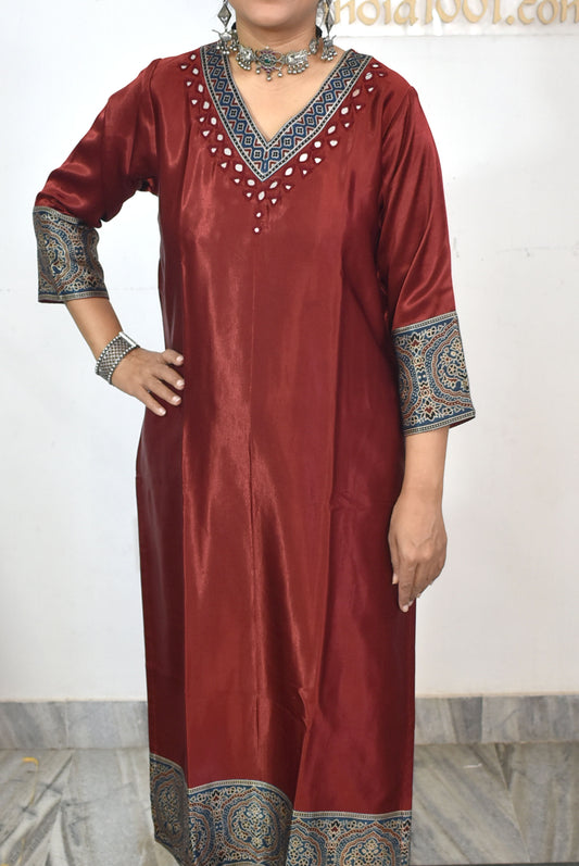 Beautiful Mashru Silk Ajrakh Kurta with Kutch mirror work size - 40-44