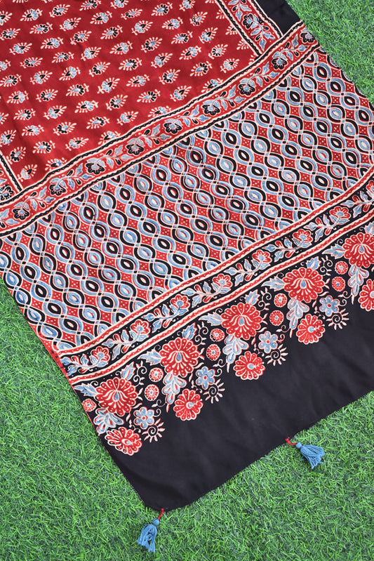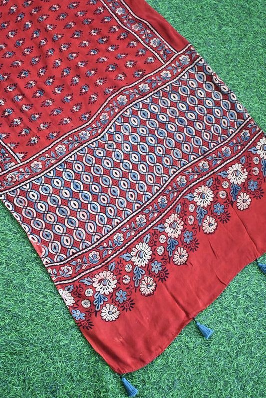 Beautiful Hand Block Printed Ajrakh Modal Silk stole with Tassels