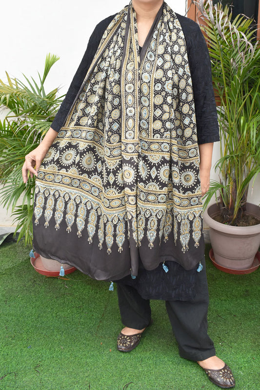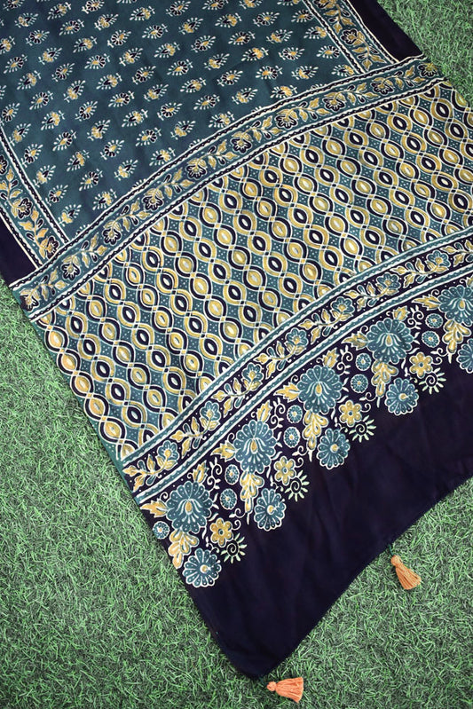 Beautiful Ajrakh Modal Silk Hand block Printed Stole with lagdi patta