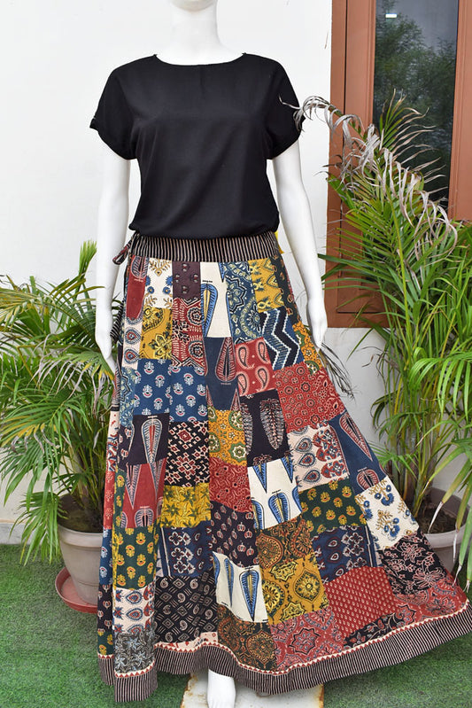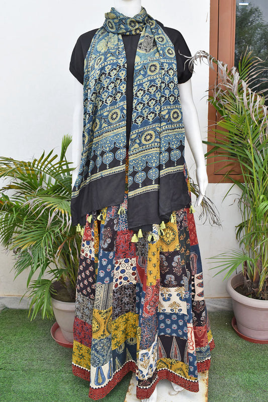 Beautiful Ajrakh Hand Block Printed Patch Work Cotton Long Skirt with Stitched borders