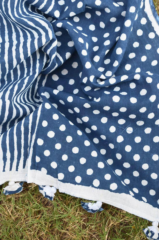 Elegant Indigo Hand block printed Cotton stole with cloth tassels