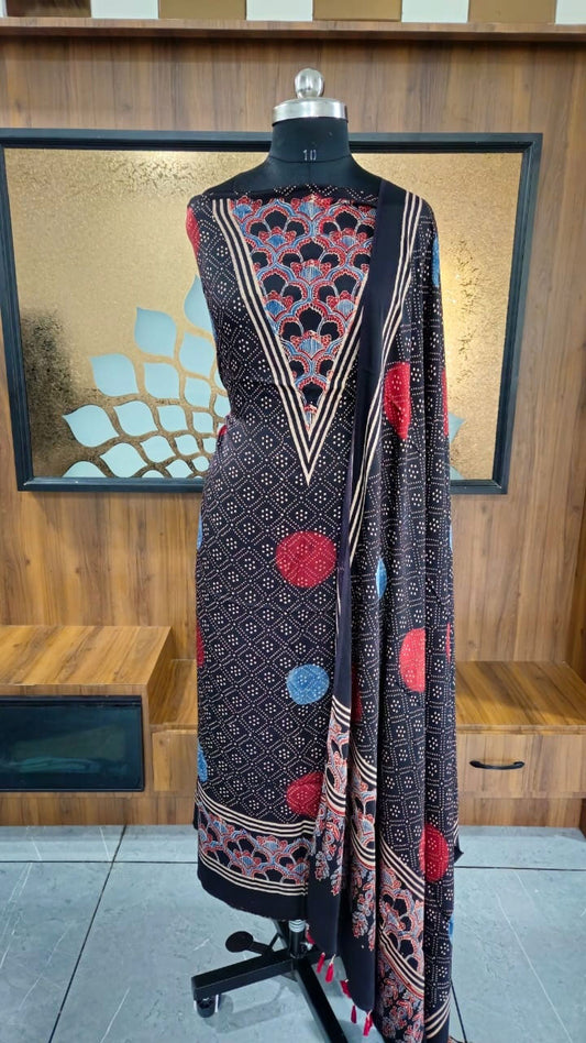 Designer Ajrakh Modal Silk Unstitched suit with panel design, Ajrakh Dupatta & Bottom- 3 piece set