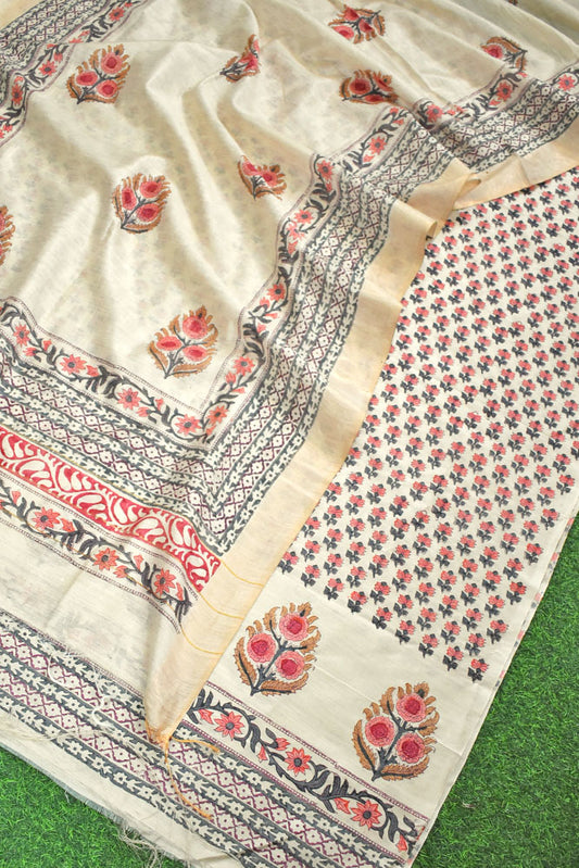 Semi Stitched Block Printed Tussar Silk Dupatta & Tussar Kurta Fabric