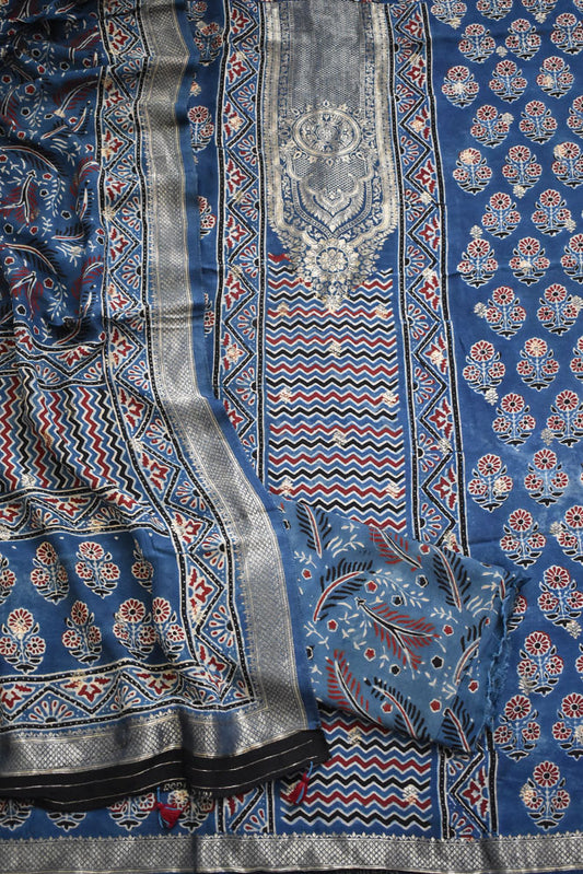 Designer Ajrakh Dola silk suit with woven bootis, neck pattern & borders - 3 pc suit