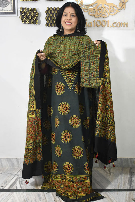 Designer Ajrakh Cotton kurta with panel design & Mirror work & Cotton dupatta - 3 piece set