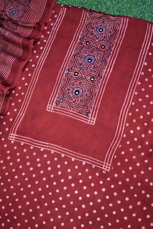 Designer Ajrakh Mashru Silk Unstitched suit with panel / yoke design- 3 piece set