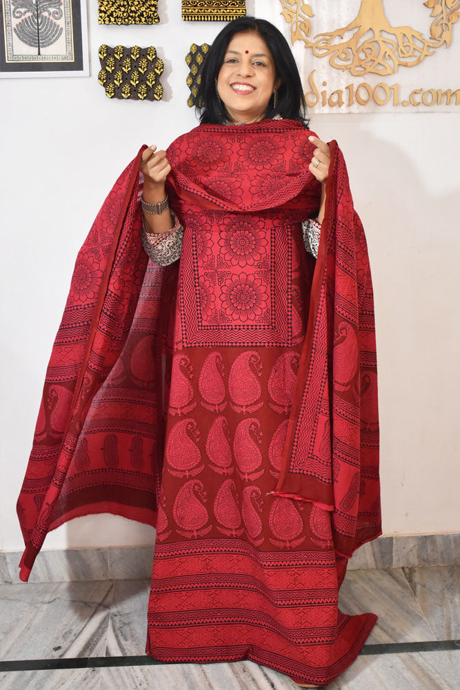 This one is a classic unstitched suit with BAGH Hand block printed cotton kurta, comes with an elegant Bagh block printed cotton dupatta and a cotton bottom fabric..