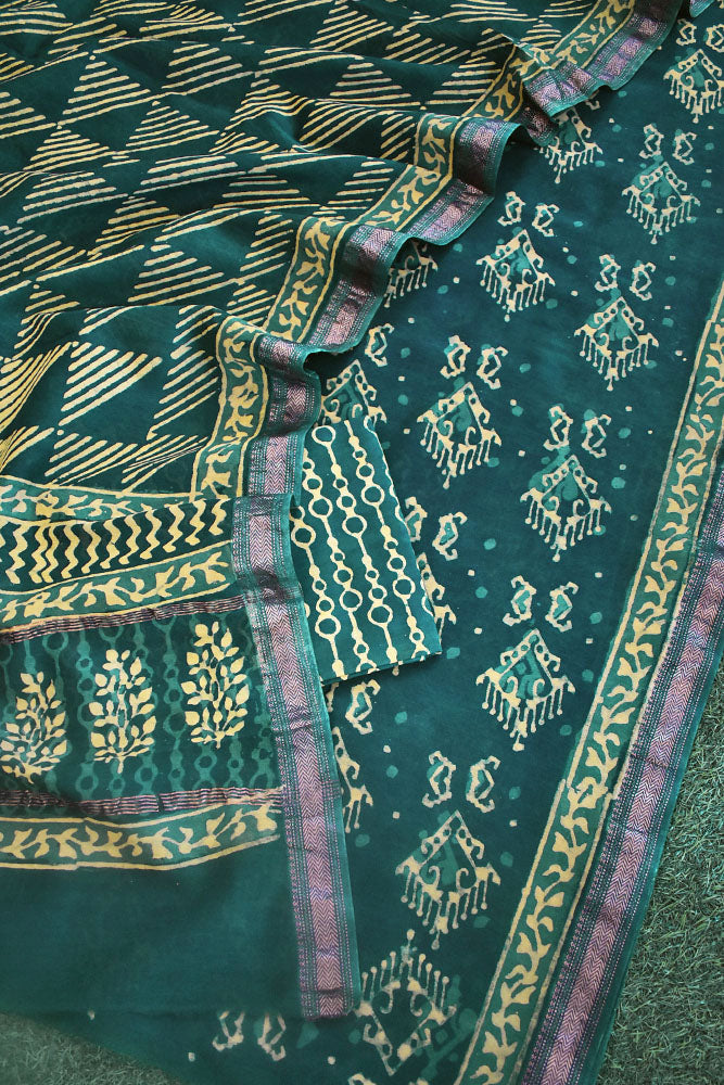 Beautiful Natural Dyed Jahota Maheshwari (Cotton-silk) unstiched set with Hand Block printed Maheshwari kurta & dupatta with broad zari border.Kurta and dupatta are in Maheshwari fabric.