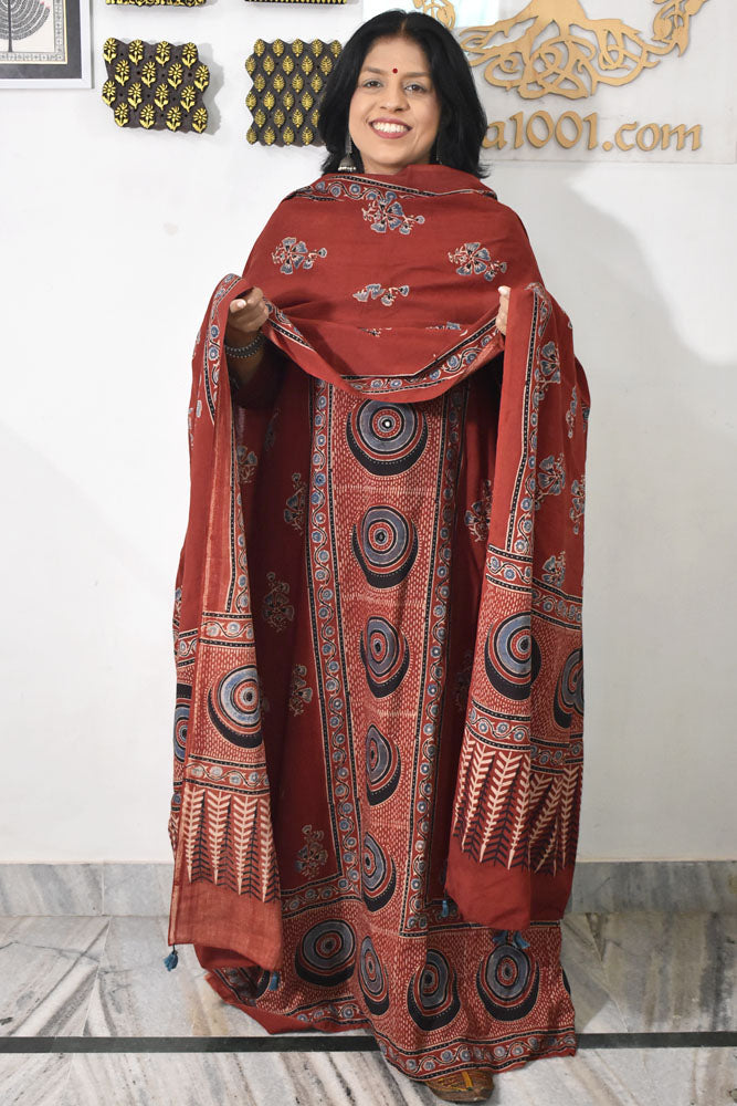 Designer Ajrakh Cotton kurta with panel design & Mirror work & Cotton dupatta - 3 piece set
