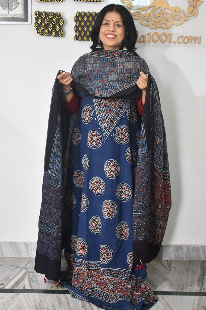 Designer Ajrakh Cotton kurta with panel design & Mirror work & Cotton dupatta - 3 piece set