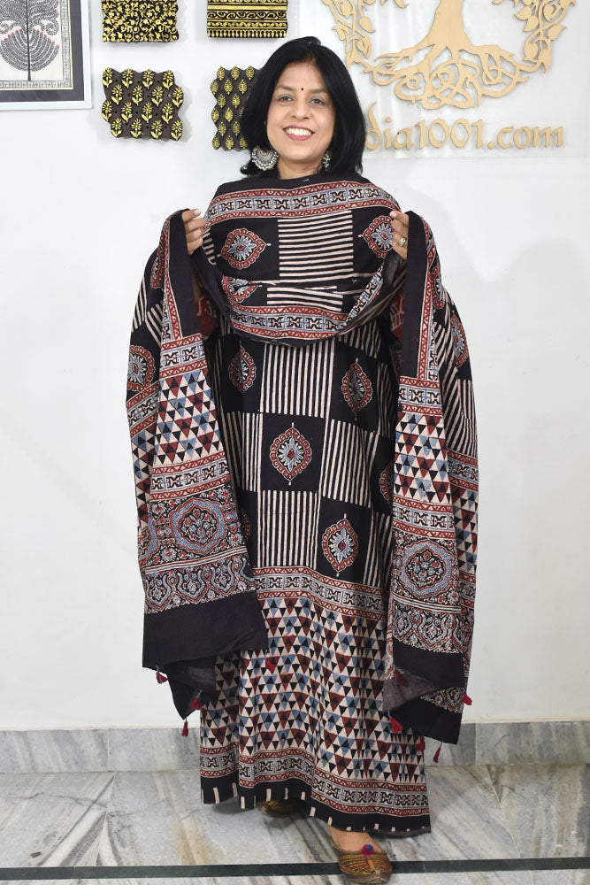 Designer Ajrakh Cotton kurta with panel design & Mirror work & Cotton dupatta - 3 piece set