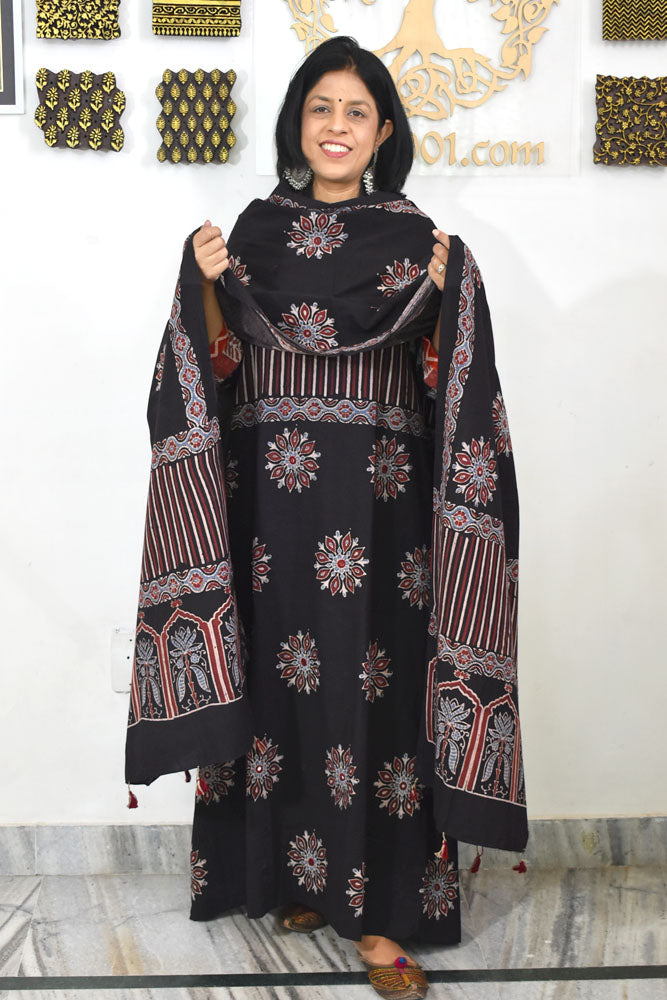 Designer Ajrakh Cotton kurta with panel design & Mirror work & Cotton dupatta - 3 piece set
