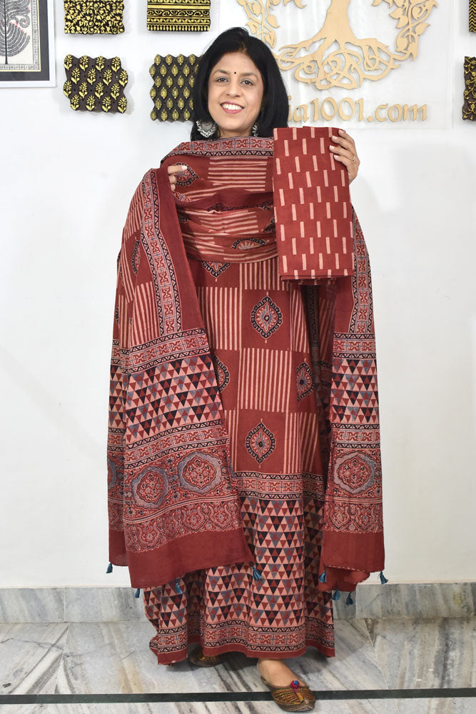 Designer Ajrakh Cotton kurta with panel design & Mirror work & Cotton dupatta - 3 piece set