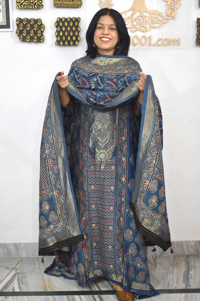 Designer Ajrakh Dola silk suit with woven bootis, neck pattern & borders - 3 pc suit