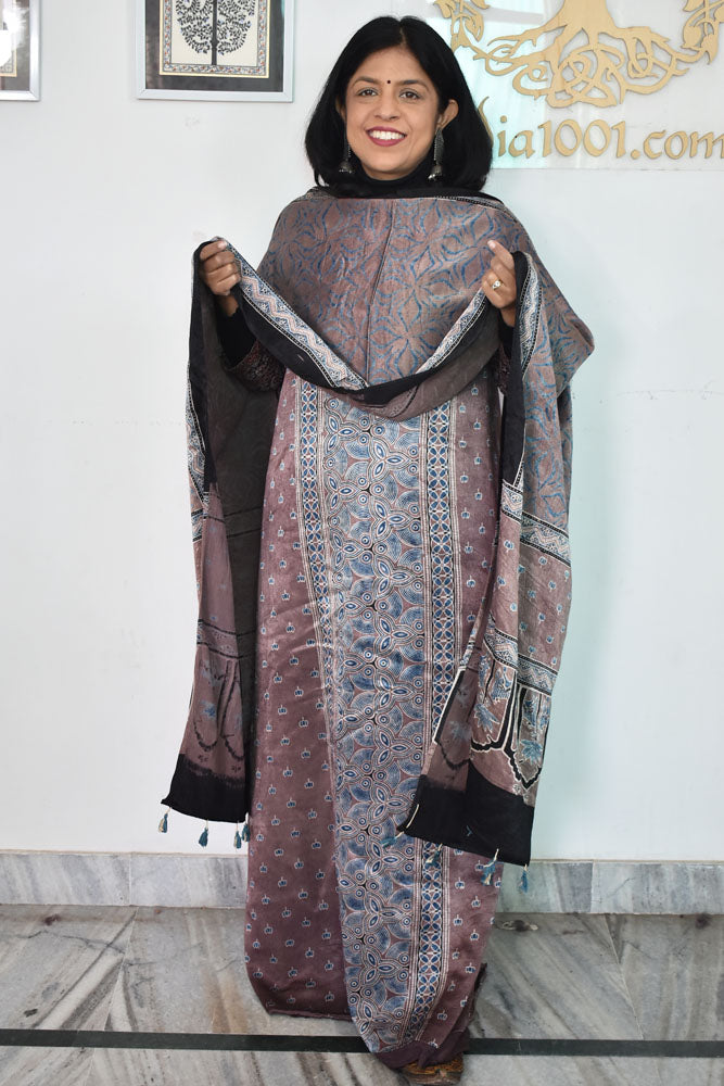 Designer Ajrakh Mashru Silk Unstitched suit with panel design / neck yoke on the kurta & Mashru silk dupatta ( width - 22 inches) - 3 piece set
