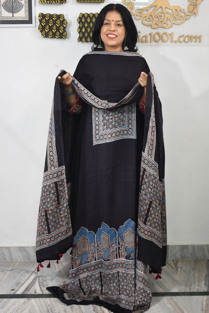 Designer Ajrakh Modal silk Kurta and Dupatta Set with Neck yoke and panel design