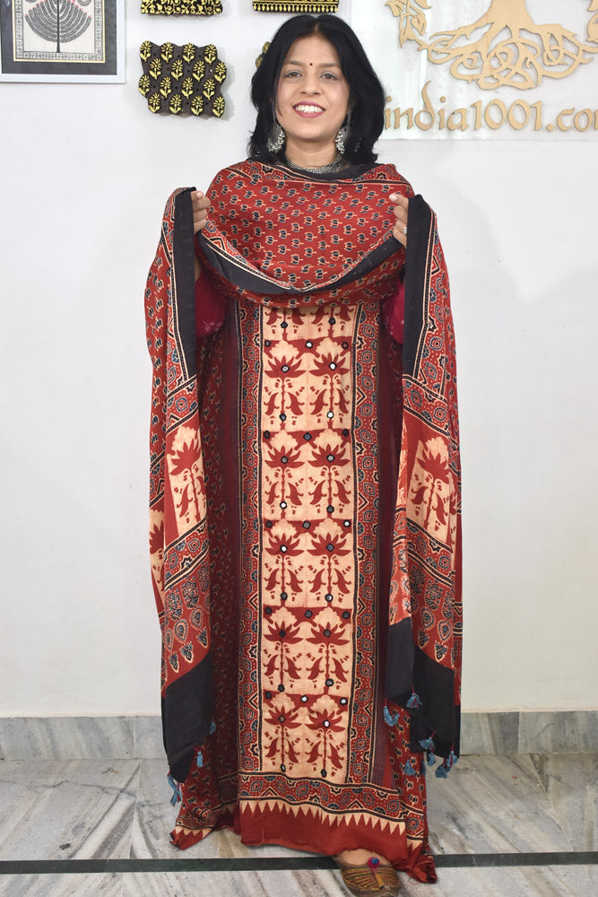 Designer Ajrakh Modal Silk kurta with panel design & Mirror work & modal silk dupatta - 2 piece set