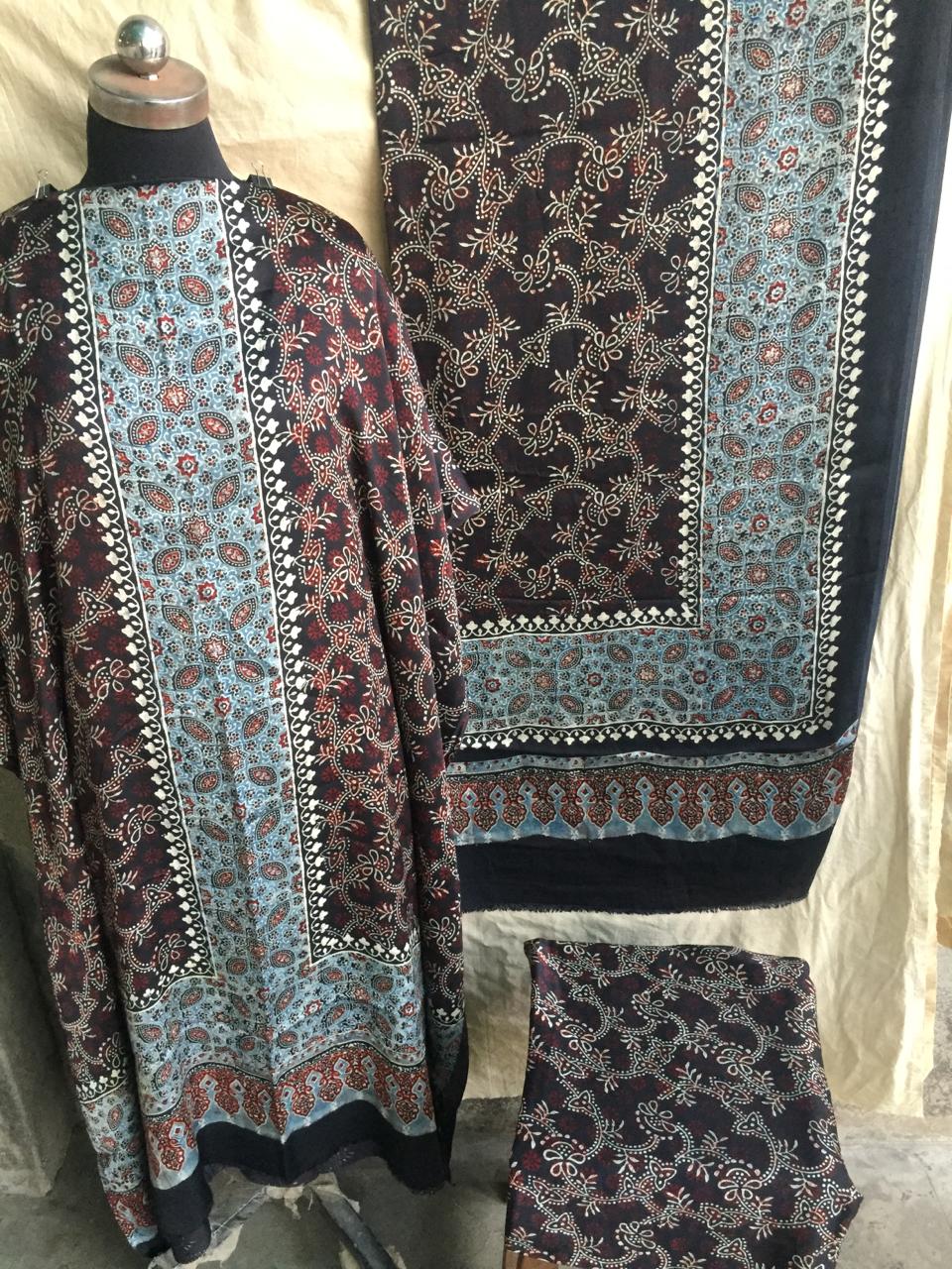 Designer Ajrakh Modal Silk Unstitched suit with Neck yoke / panel design - 3 piece set