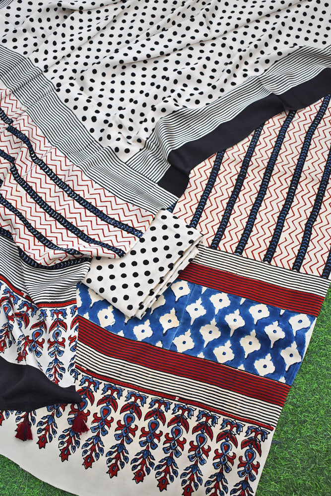 Designer Ajrakh Modal Silk Unstitched suit with panel design, Ajrakh Dupatta & Bottom- 3 piece set