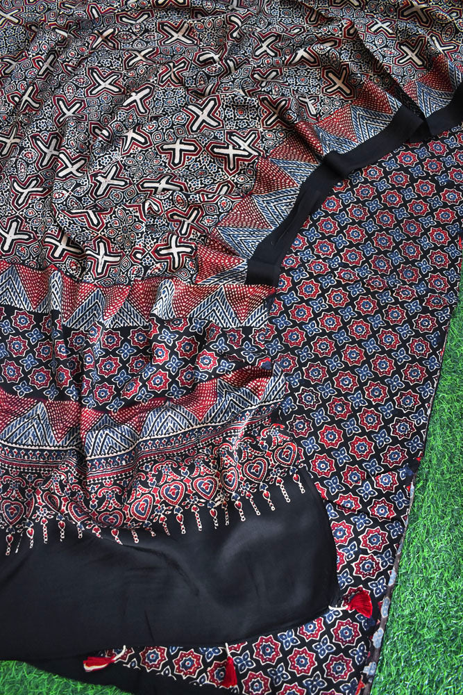 Designer Hand Block Printed Ajrakh Modal Silk Kurta and Dupatta Set, Dupatta has tassels as well.