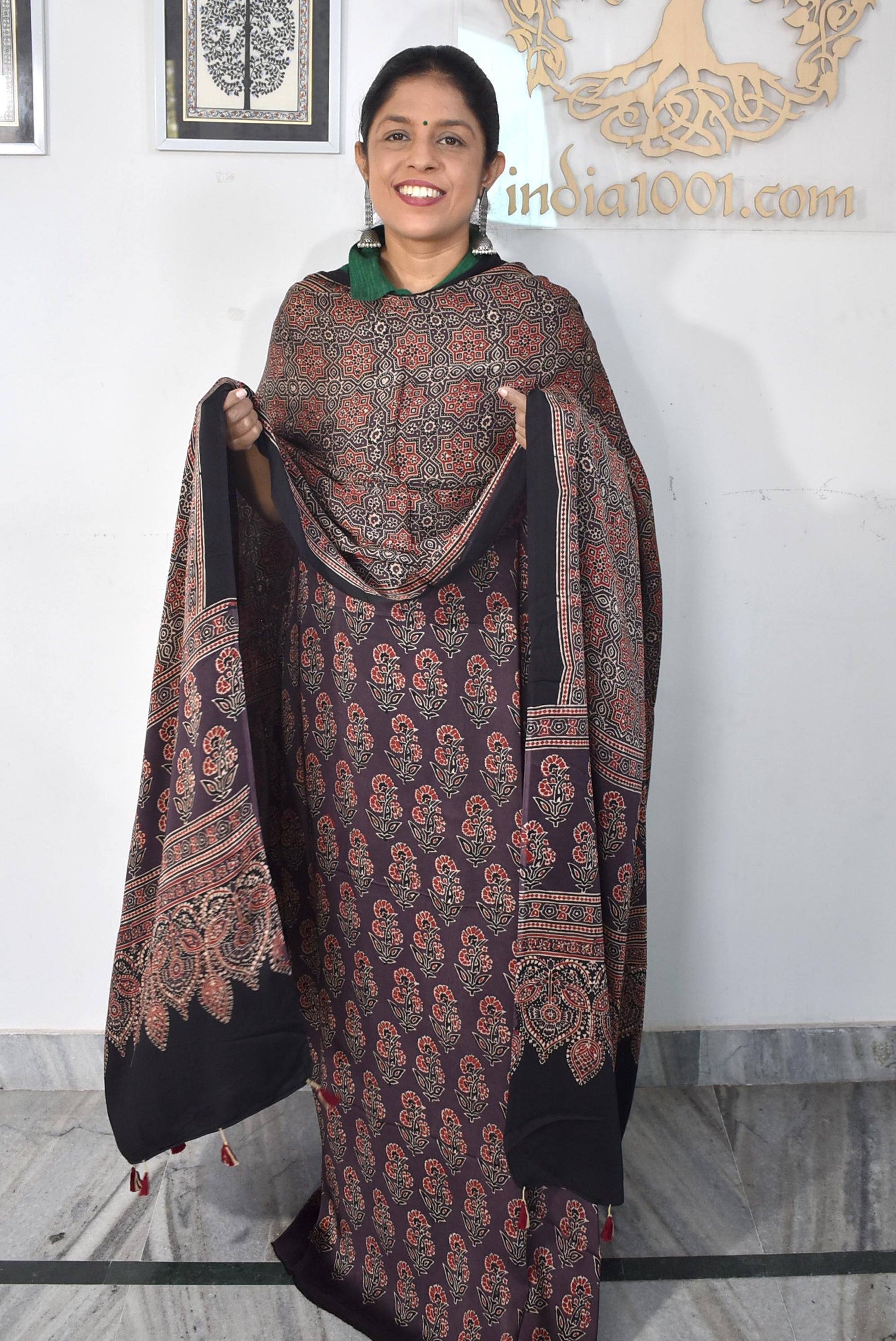 Designer Kutch Ajrakh Modal Silk Kurta and Dupatta with tassels