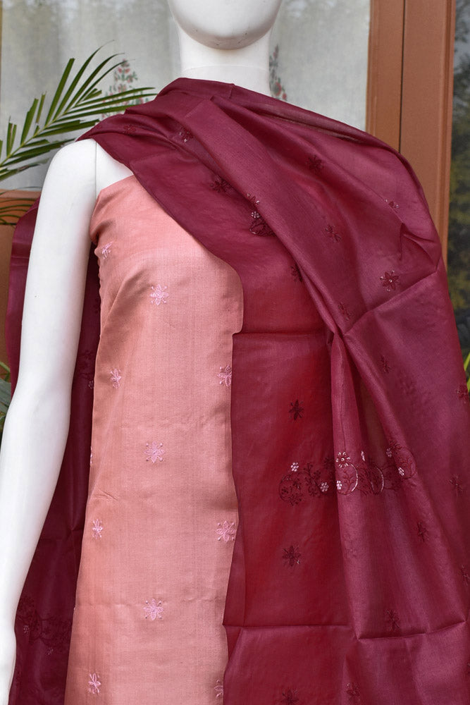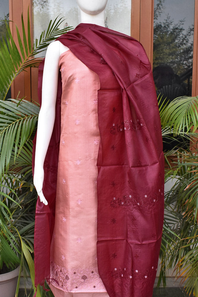 Elegant Tussar Silk Unstitched suit with Embroidered Kurta and Dupatta & blended silk bottom