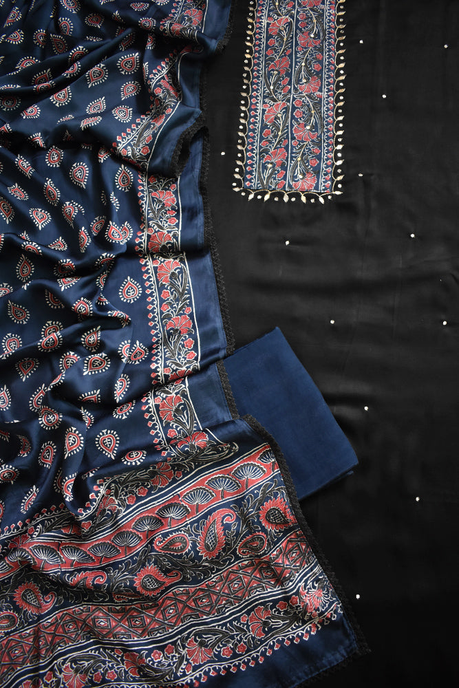 Hand Block print Modal Silk suit with Foil mirrors and Gota Patti Work