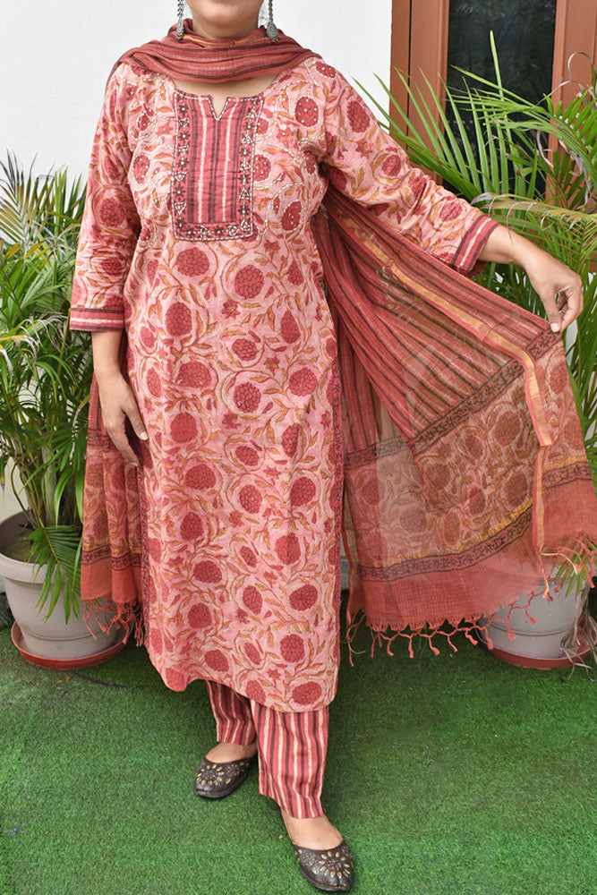 Earthy Hand Block Printed Cotton suit with Hand Embroidery - Kurta ,Kota Dupatta & Pant - size 38 to 48