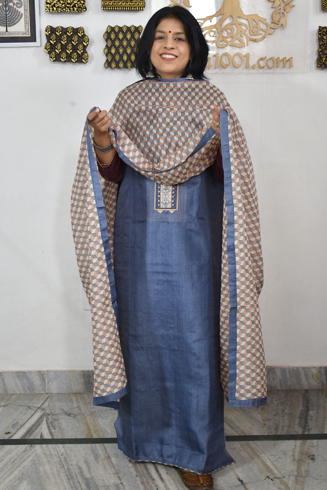 Semi Stitched Block Printed Tussar Silk Dupatta & Tussar Kurta Fabric