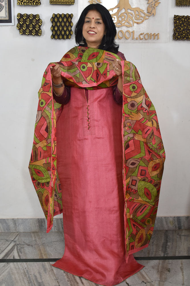Block Printed Tussar Silk Dupatta & Tussar Kurta Fabric. Kurta fabric is semi stitched and lining is already given.